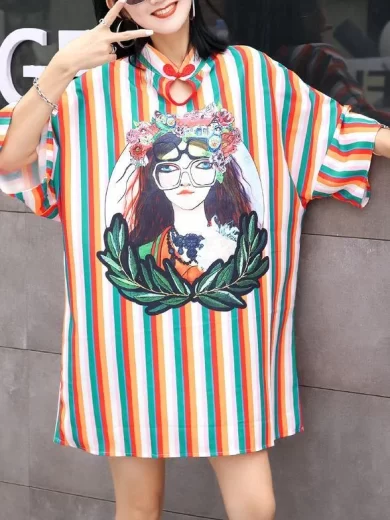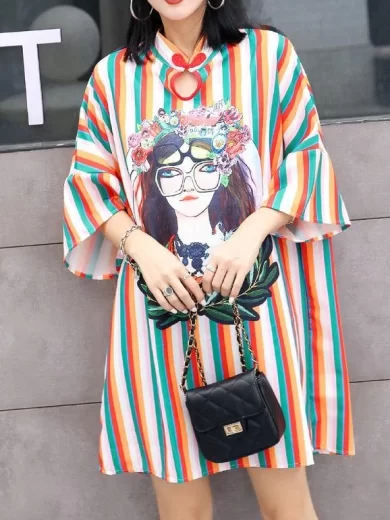 Style Chinese Button Cotton Wardrobes Fashion Ideas striped prints Dress summer