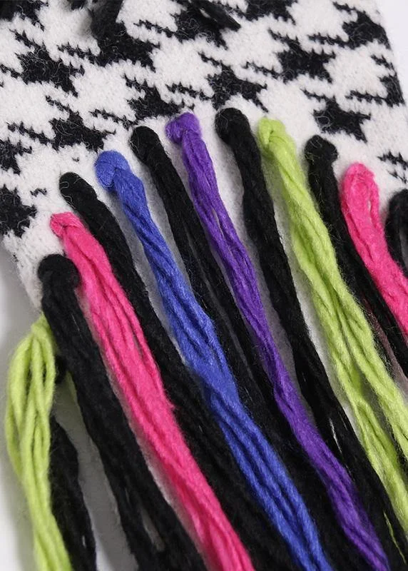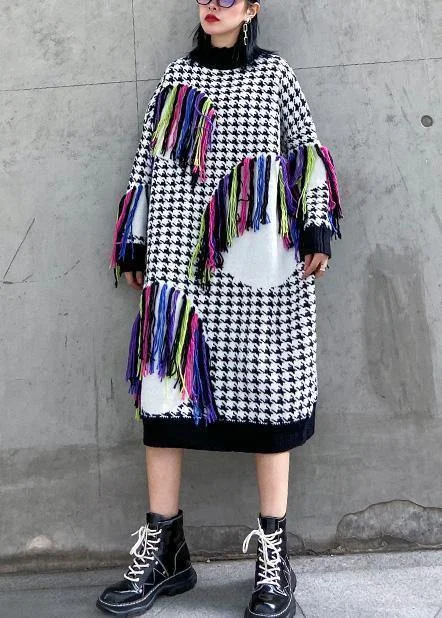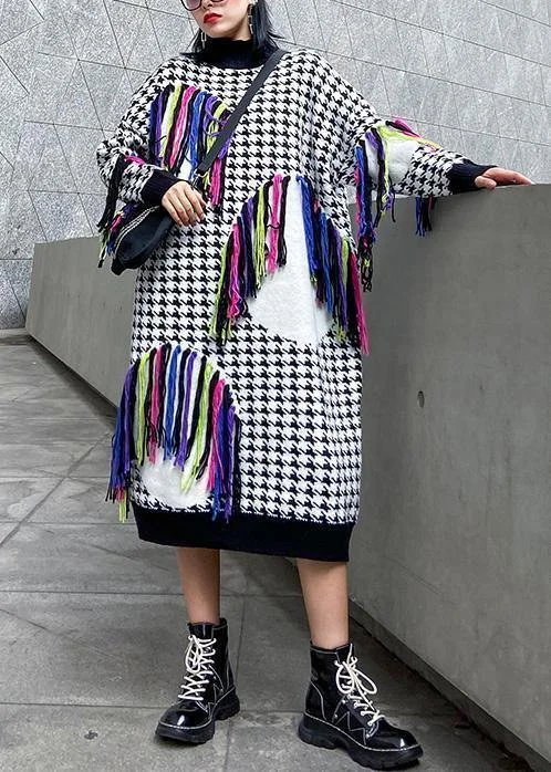 Knitted plaid Sweater dresses Design tassel oversized high neck sweater dresses