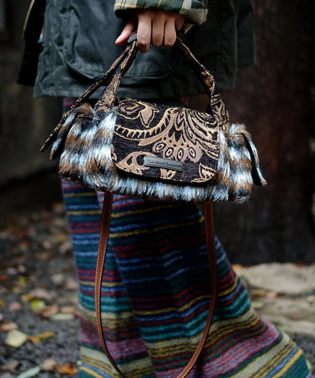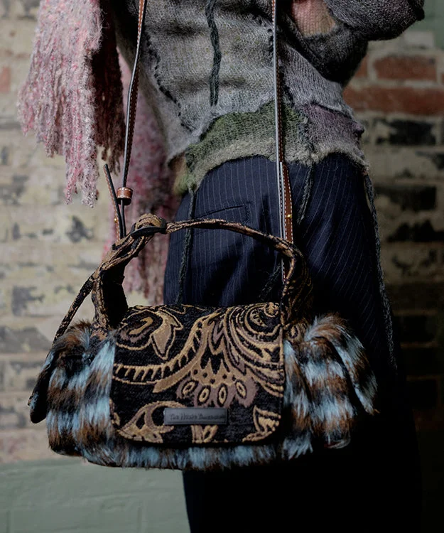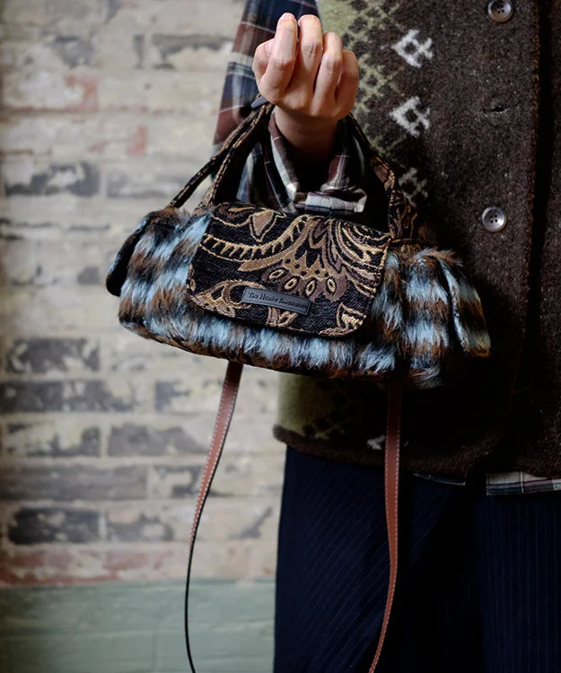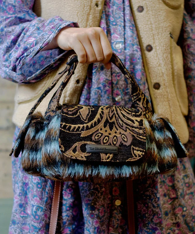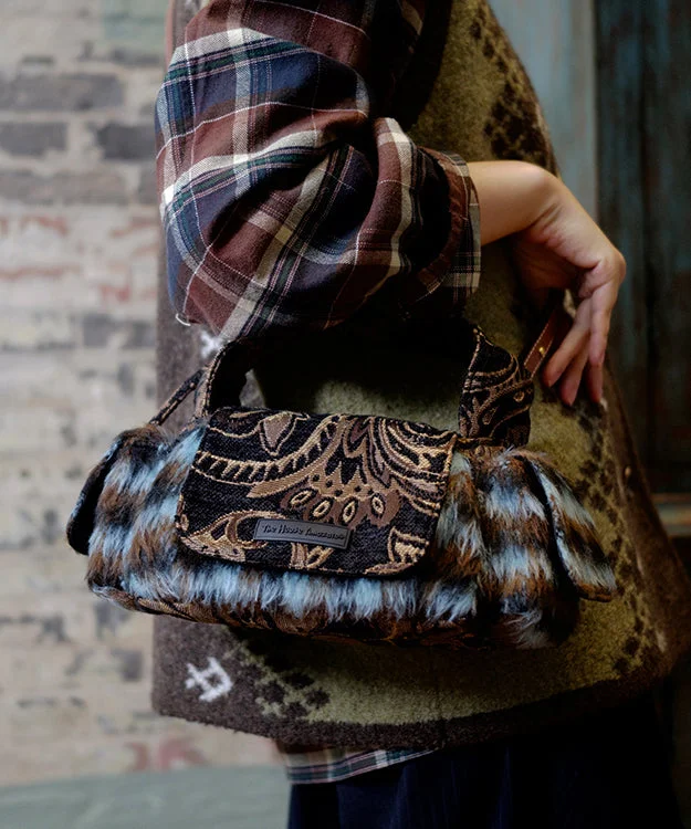 Original Design Blue Jacquard Fuzzy Fur Patchwork Tote Bag